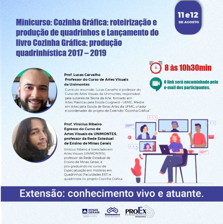 A atividade será ministrada pelo Prof. Lucas Carvalho, Coordenador do Cozinha Gráfica e roteirista dos quadrinhos do projeto, e pelo Prof. Vinicius Ribeiro, pós-graduando em especialização em Histórias em Quadrinhos e responsável pelo desenhos do quadrinhos do Cozinha Gráfica.