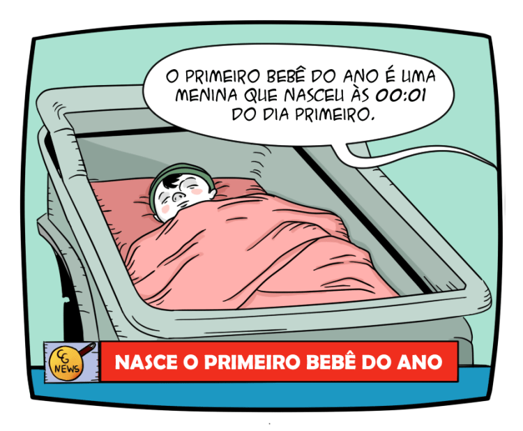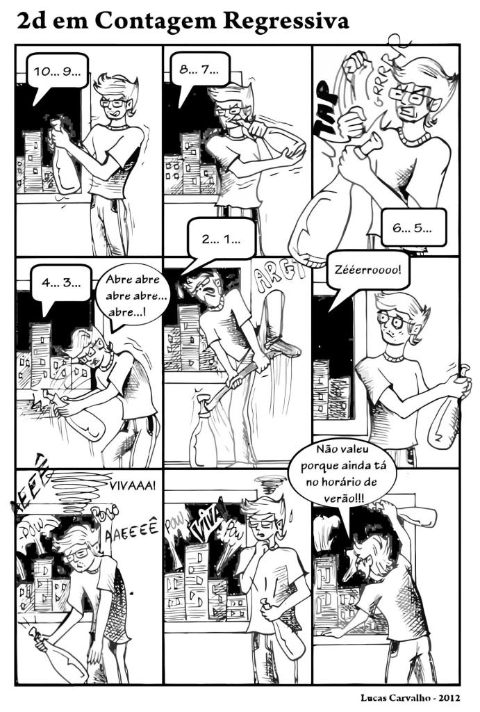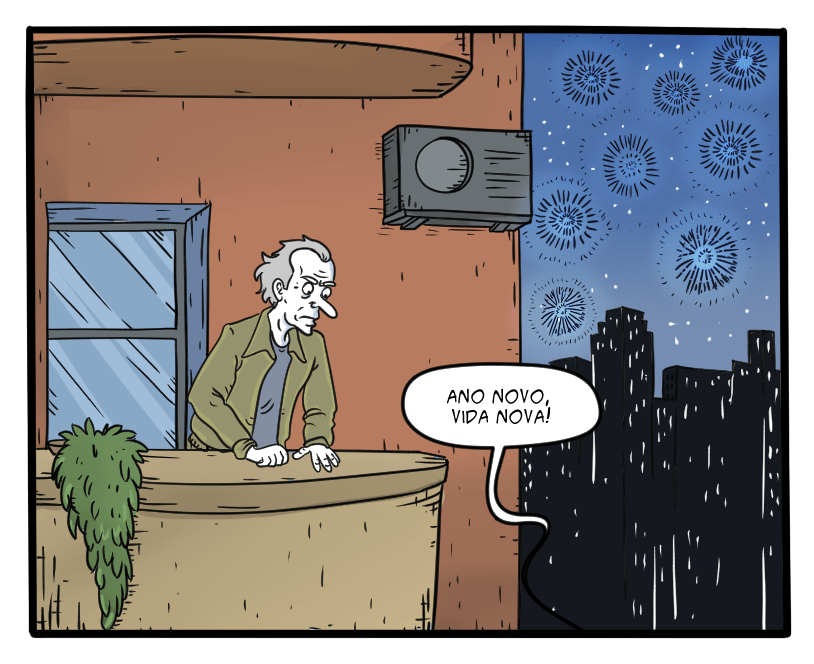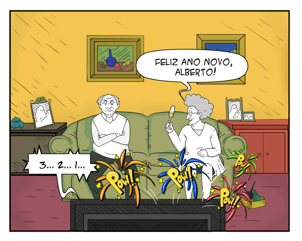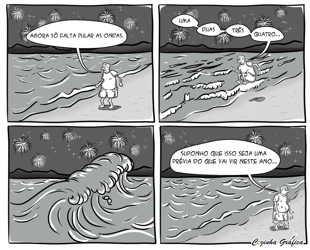 Um pequeno conto de réveillon, acompanhado por tirinhas e imagens com o tema do Ano Novo.