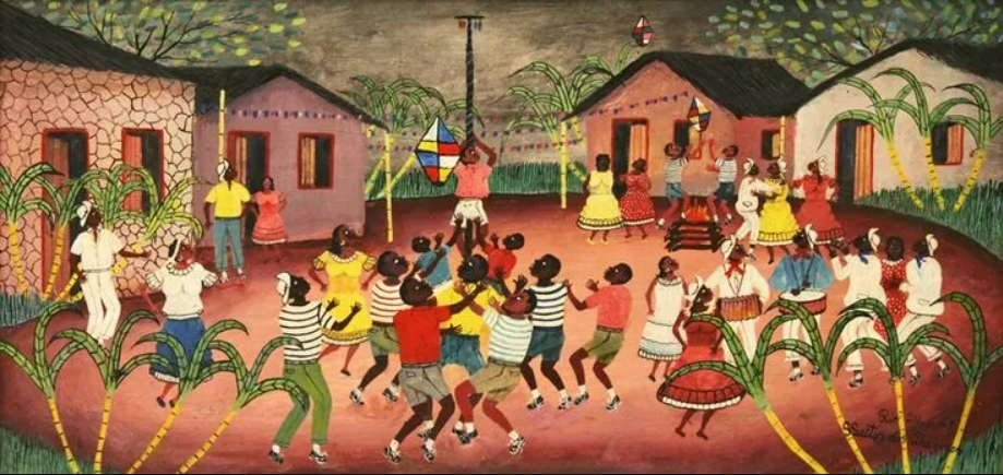 O São João de Heitor do Prazeres mostra essa “cultura de resistência negra pós-abolicionista” (TONETO, L. C, 2019, p. 68). A metáfora do palco é propícia: com casas como cenário ao fundo, a obra coloca os personagens num centro de protagonismo, numa representação, ao mesmo tempo, intimista e igualitária, uma marca do artista; de singularizá-los na sua coletividade.
