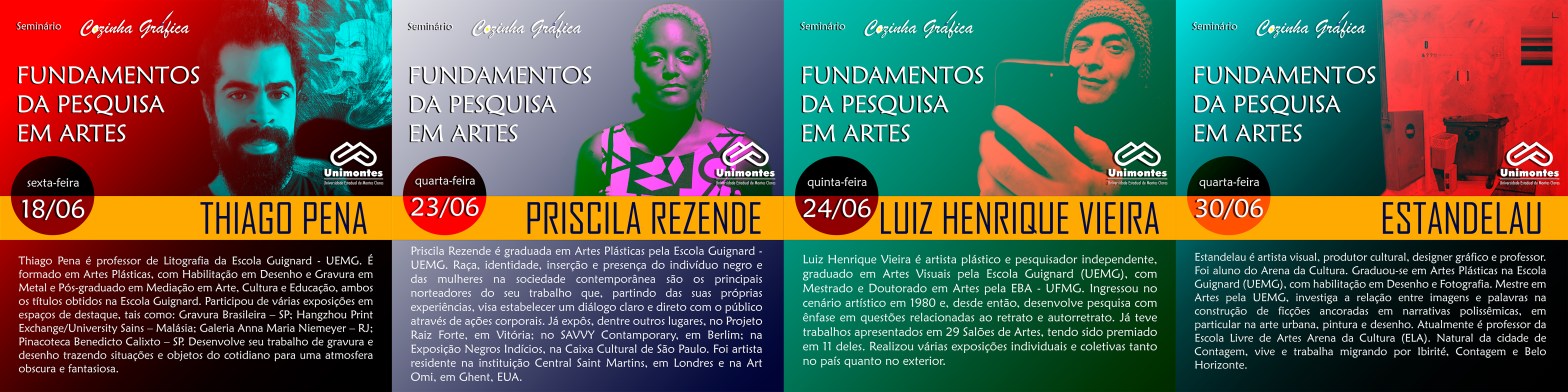 O Cozinha Gráfica realizou, no mês de junho de 2021, seu primeiro seminário institucional para discutir as pesquisas em/sobre artes Da Cozinha Nos dias 18, 23, 24 e 30 de junho, foi realizado o 1º Seminário “Cozinha Gráfica” de Fundamentos da Pesquisa em Artes, que contou com a participação dos artistas Thiago Pena, Priscila Rezende,Continuar lendo “1º Seminário “Cozinha Gráfica” de Fundamentos da Pesquisa em Artes”