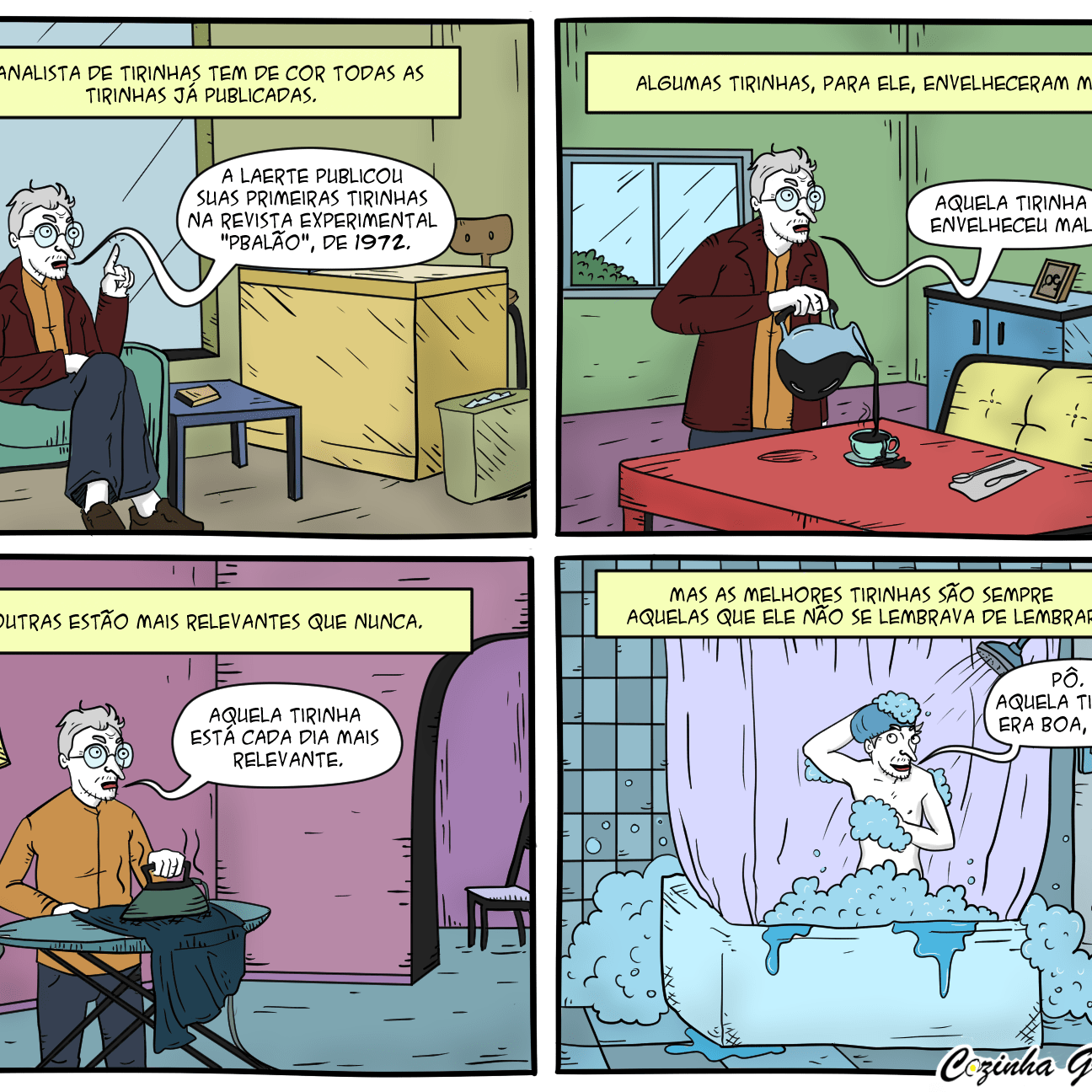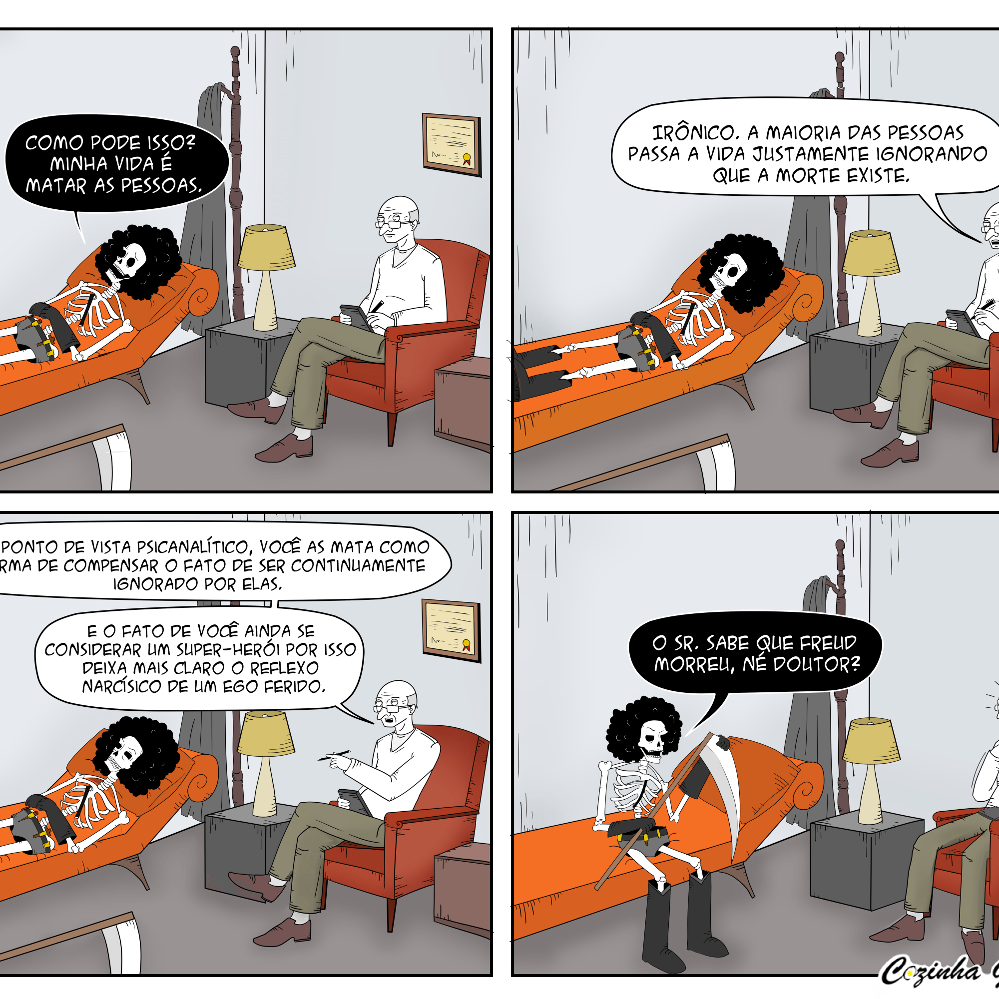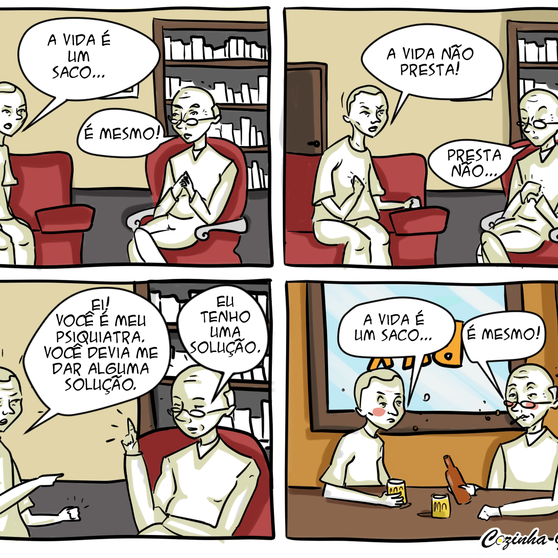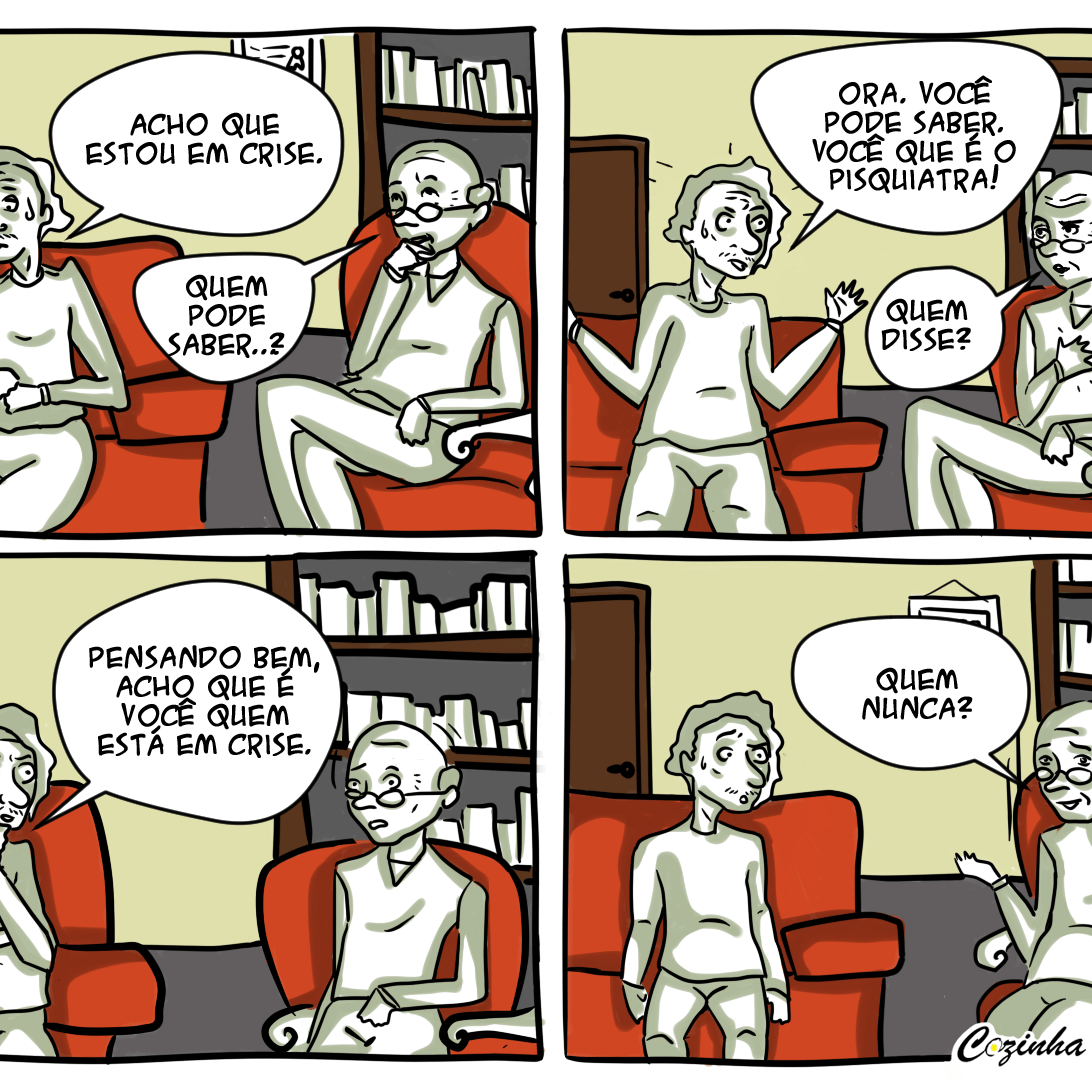 Comparação entre a primeira tirinha produzida, que trouxe também a primeira aparição do psicanalista, e a mais recente tirinha com o personagem: